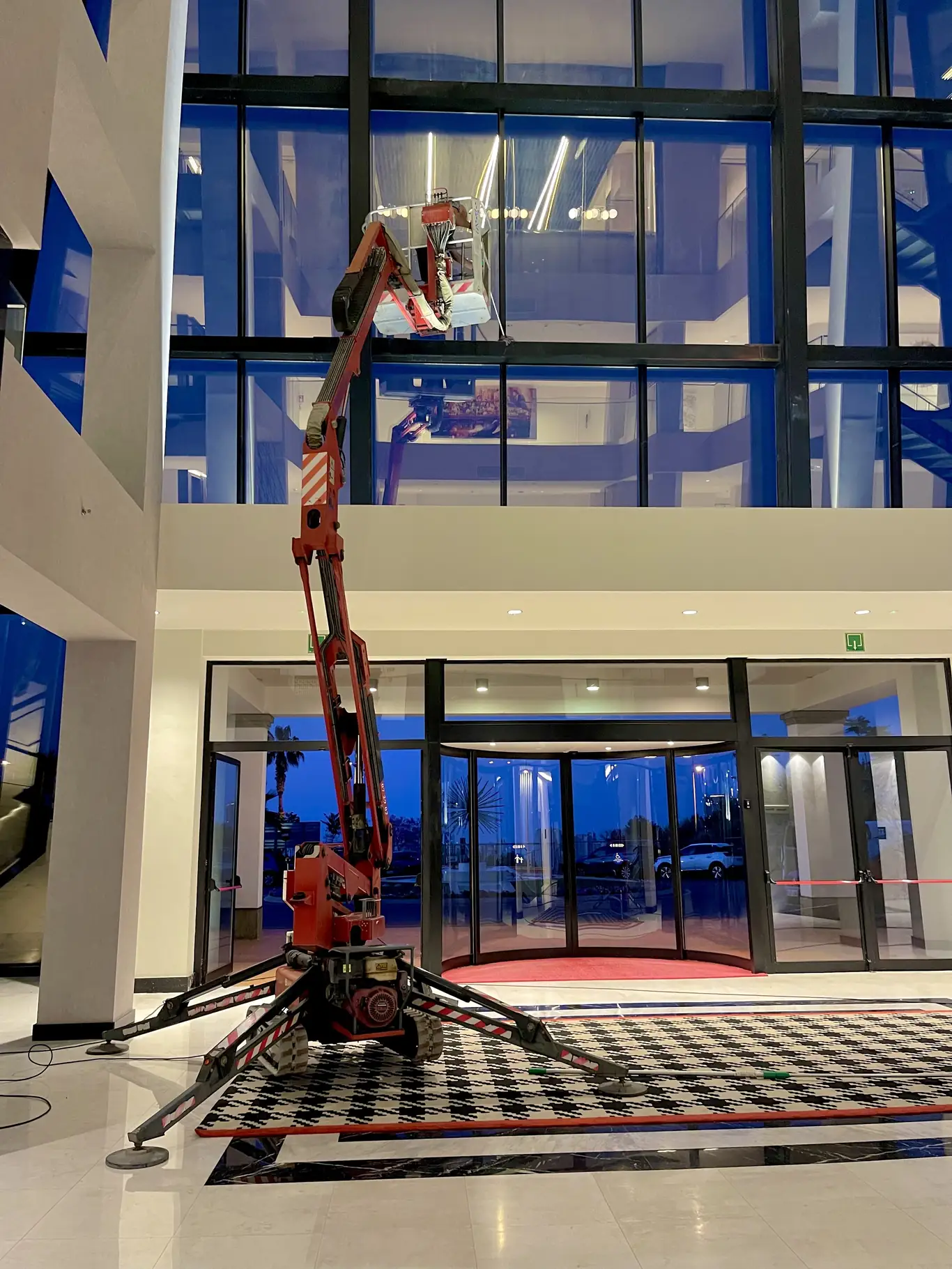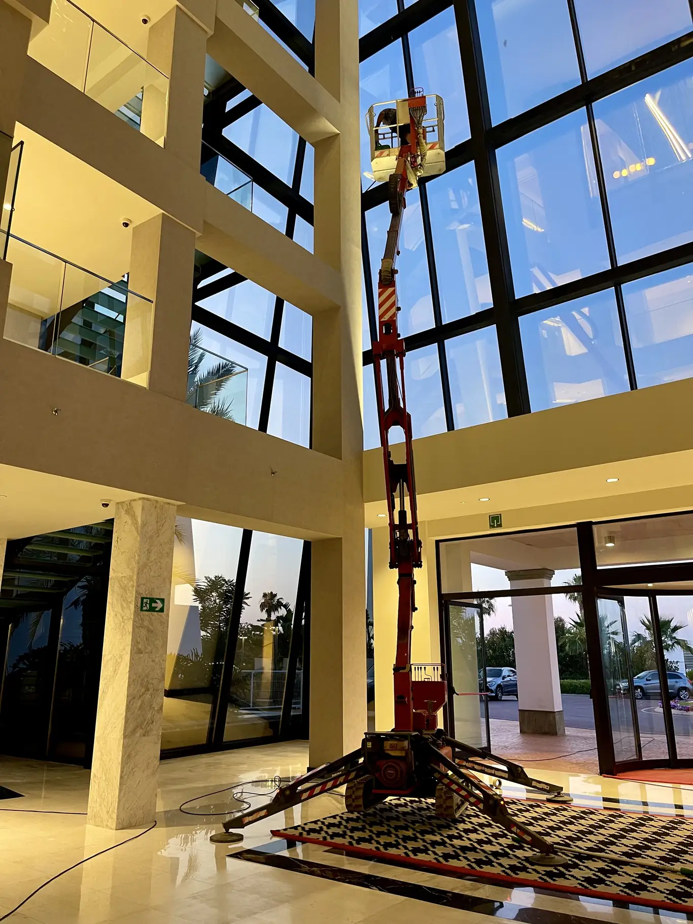 Para acceder a los puntos más complejos de este hotel operamos con nuestra grúa araña, plataformas articuladas y elevadores de tijera. Esta combinación de equipos nos permite adaptarnos a cualquier geometría del espacio: techos altos, pasillos estrechos, lobbies acristalados o fachadas con salientes. Sin andamios, sin estructuras provisionales, sin interrupciones para el establecimiento.
